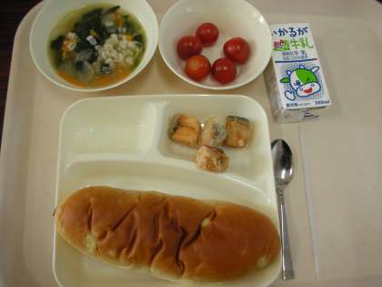 本日は、鮭のマリネ、肉団子と麦のスープ、プチトマト、パン、牛乳でした。