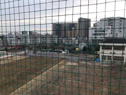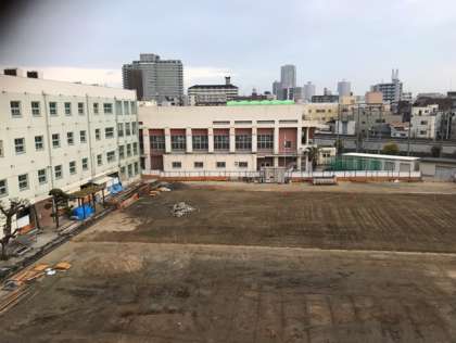上の写真は、西館4階から、運動場東側を撮ったものです。格技室棟の北側にあった、工事事務所として使われていた2棟のプレハブが、昨日解体されました。下の写真は、南館4階から、運動場北側を撮ったものです。西館保健室前の工事現場では、西館から運動場へ出るためのスロープが造られています。着実に工事が進んでいます。