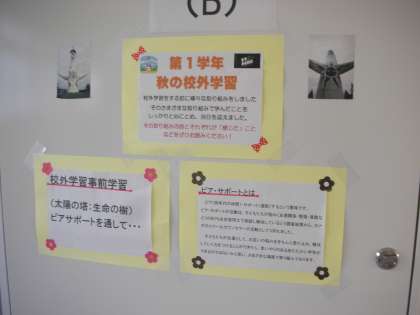 新校舎3階の廊下に、1年生の『秋の校外学習』について、まとめた『壁新聞』が掲示されています。