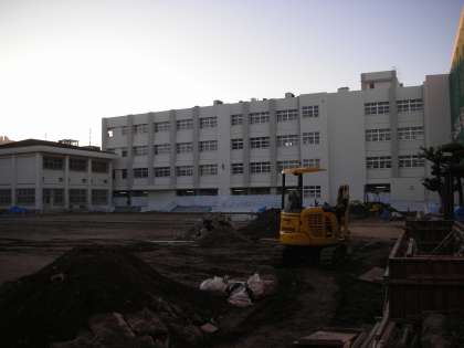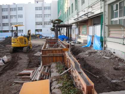 上は、体育館前から見た調理室横の工事現場です。木枠が組まれ、コンクリートが流し込まれています。