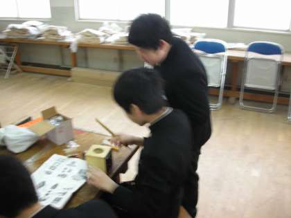 キリで穴をあけ、木ねじで部品をとめています。男子も女子も一生懸命です。