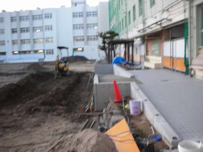写真は、体育館前から見た調理室付近の工事現場です。スロープがきれいに整備され、側溝が作られています。あと一息ですね。