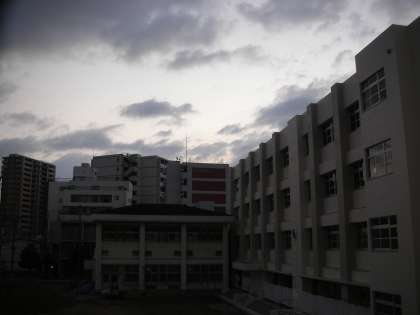 写真は、西校舎2階から見た東の空です。朝日はまだ、校舎の向こう側です。