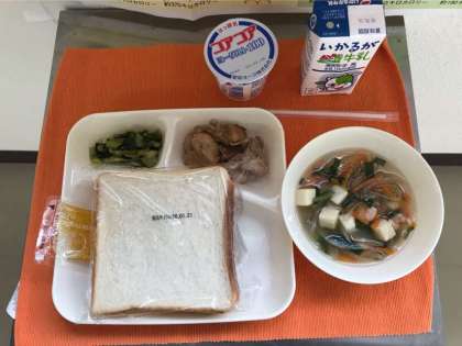本日の献立は、鶏肉のオイスターソース焼き、えびととうふのスープ、チンゲンサイのピリ辛あえ、ヨーグルト、食パン・マーマレード、牛乳です。スープは「個別対応献立」です。