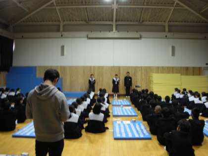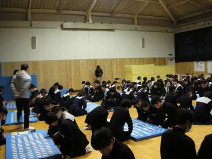 1年生は、5時間目、6時間目の総合の時間を使って、『百人一首大会』を格技室で行っています。開会式が終わり、競技が始まりました。
