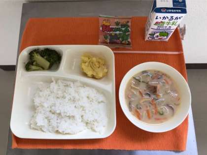 本日の献立は、かす汁、ブロッコリーのしょうがづけ、くりきんとん、豆こんぶ、ご飯、牛乳でした。