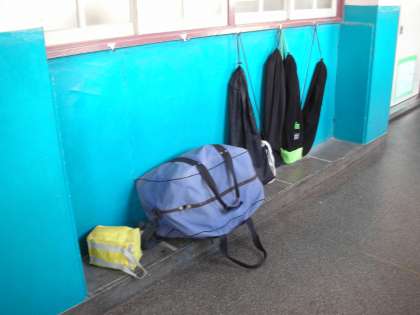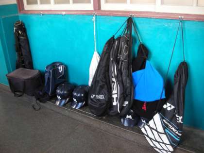 このフックにテニスのラケットがつるされています。つるすことができないヘルメットや大きなカバンは、きれいに整頓されて保管されています。とても良いことですね。