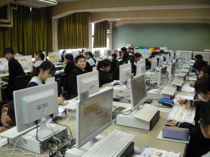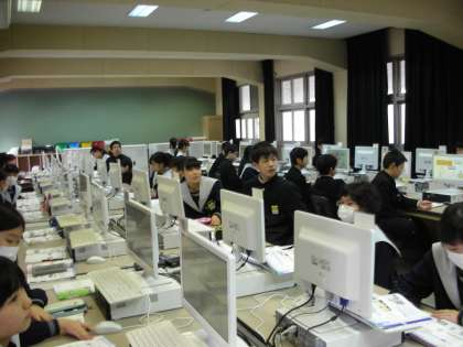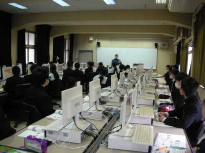 パソコン室で、パソコンの画面を見ながら、本棚の製作の復習をしています。