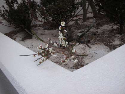 正門玄関に植えられた植物の中に、小さな梅の木があります。