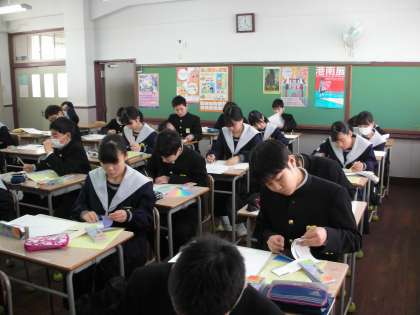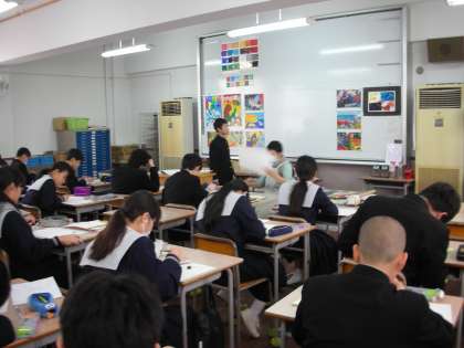 1年3組は美術の授業です。色見本を見ながら、自分の図案にどの色を使うのか、頭をひねっていました。