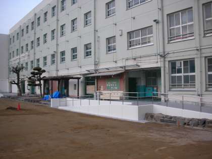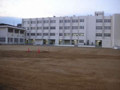 体育館前から見た左側は新校舎、右側は西校舎です。