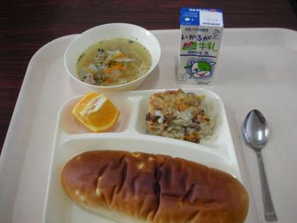 本日は、押し麦のグラタン、スープ、いよかん、パン、牛乳でした。