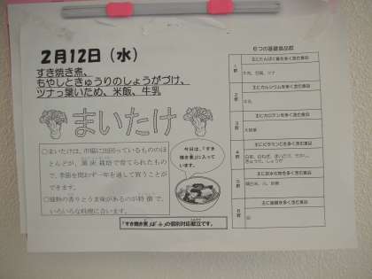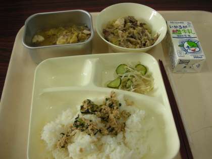 本日は、すき焼き煮、もやしときゅうりのしょうがづけ、ツナッ葉いため、ごはん、牛乳でした。すき焼き煮は、個別対応献立になっています。『ふ』が対象になります。