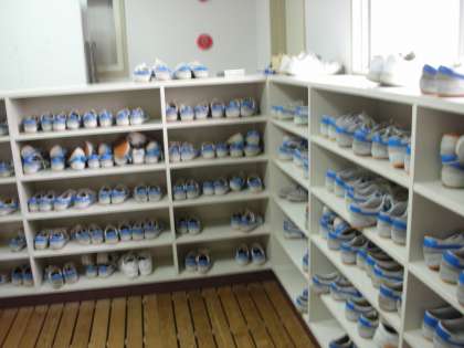 靴箱には、上靴がきれいに並べられています。入りきらないものは、一番上に置かれています。