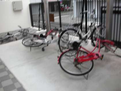 自転車置き場の自転車が風でなぎ倒されていました。 昨夜は相当強い風が吹いたものと思われます。