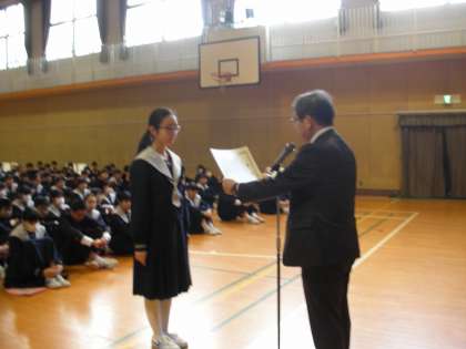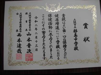 全校集会では、いただいた表彰状を全校生徒に紹介しています。今日は、良い歯を守る取り組みが評価され、大阪市学校歯科医会より、表彰状をいただきました。