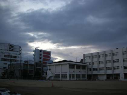 上の写真は、体育館側から見た格技室方向の空です。グレーの分厚い雲の間から日の出の明るい光がのぞいています。