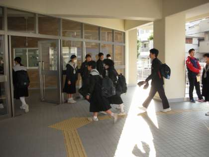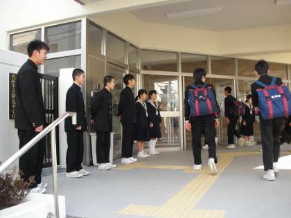 生徒会役員、風紀委員が正門玄関に立ち、『あいさつ運動』を行っています。