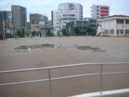 調理室前から見たグラウンドです。 昨夜の雨で、水たまりができています。