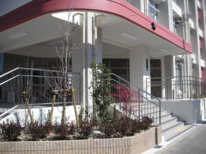 写真は、お昼の12時に撮影した正門玄関です。日光がまぶしく校舎に照り付けています。この紫外線で、今問題になっているウイルスをやっつけてほしいですね。