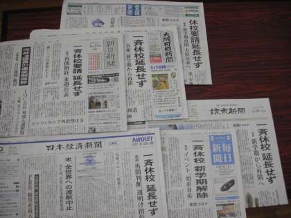 今日の新聞では、各紙とも『一斉休校』を延長しないことが大きな見出しに出ていました。