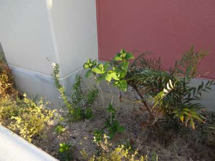 玄関スロープ横の花壇です。アジサイの葉が広がっています。しっかりと根付いたようです。