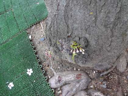 体育館前のソメイヨシノの足元を見ると、地面に近い幹の部分から、こんにちは。花のつぼみが複数出ています。