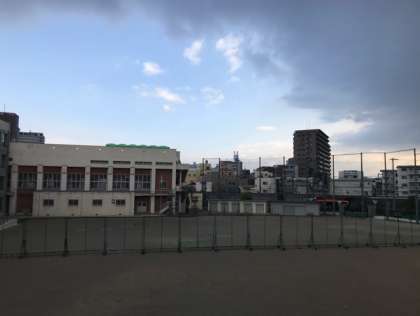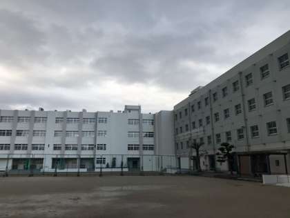 写真は、左は体育館前から見た南校舎・西校舎、右は南校舎から体育館方向を、それぞれ撮影したものです。
