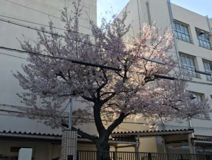 今日は、昨日より少し肌寒さが和らいでいるようです。体育館前の桜の花は、風を受けるごとに花びらをはらはらと散らせ、代わりに緑の葉が少しずつ増えてきています。
