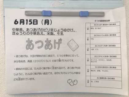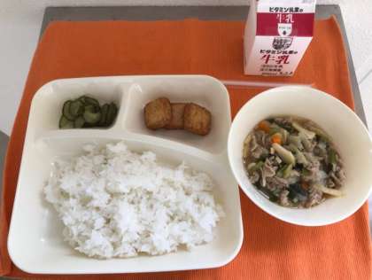 今日のメニューは、中華煮、あつあげのピリ辛じょうゆがけ、きゅうりの中華あえ、ご飯、牛乳でした。米飯もおかずもとても久しぶりで、いつも以上においしく感じました。美味しい給食をごちそうさまでした。