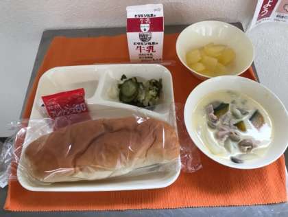 本日の給食は、かぼちゃのクリームシチュー、ミックス海そうのサラダ、りんご(缶)、コッペパン、いちごジャム、牛乳です。