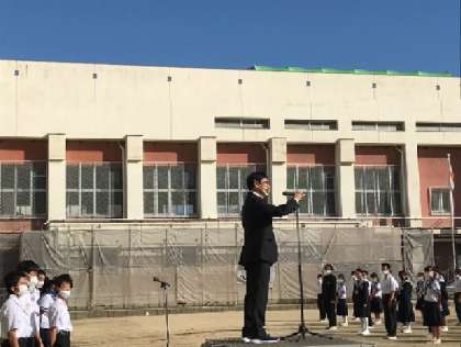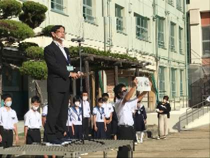 学校の様子(校長講話)本日は、久しぶりに運動場で全校集会がありました。本日の講話です。新しい生活様式として身体的距離をとることが、必要不可欠となっている今。不安な日々を過ごしていることだと思います。身体的距離が離れると、心理的距離が離れていくといわれます。だからこそ、声をかける際には、身振り・手振り・にこやかな表情などを大切にして、あいさつの「質」を高めてください。距離はとっても、心は近く、心の感染防止に心掛けましょう。今週も体調には十分気を付けて頑張っていきましょうとのお話でした。