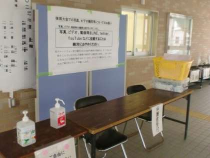 保護者のみなさまへ、本日開催するスポーツ大会のご観覧は、新型コロナ感染症対策のため、事前にお申し込みいただいている3年生の保護者のみとさせていただいております。来場者健康状態確認書に必要事項をご記入の上、入校証とともに受付をしていただきますようよろしくお願いいたします。大変申し訳ありませんがよろしくお願いいたします。