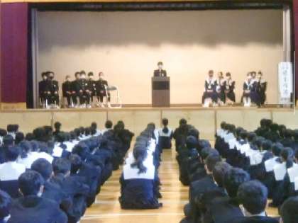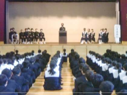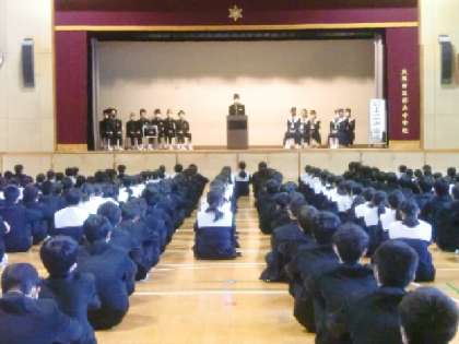 学校の様子(立会演説会)3名の会長立候補があり、皆それぞれに公約を述べ真剣そのものでした。選ぶ皆さんも、真剣に聴いていました。