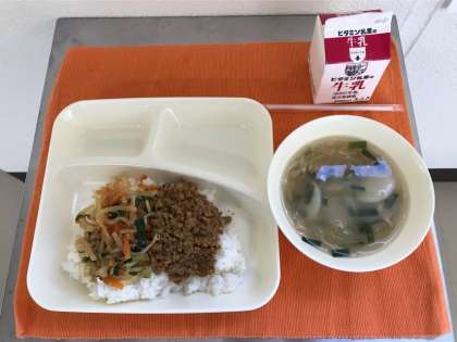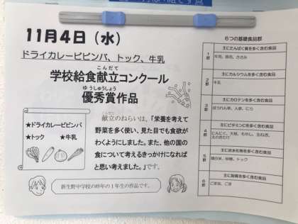 学校の様子(給食)本日のメニューは、昨年の新生野中学校の1年生が応募した学校給食献立コンクールの優秀賞作品の給食メニューです。応募作品が、メニューとなり作られ、皆が食べる。現実となる喜びは素敵ですね。