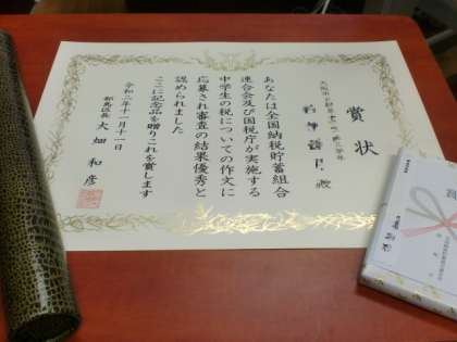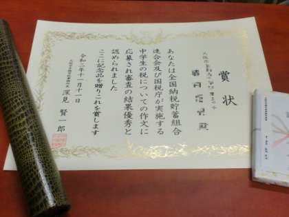 学校の様子(全校集会)「税についての作文」表彰。「税をおさめる大切さについて」で藤田さんが、大阪市京橋税事務所長賞。「未来をつくる税の在り方」で杉井さんが都島区長賞をいただきました。
