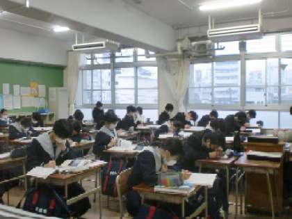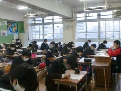 学校の様子(3年生)昨日、受験の事前指導がありました。本日は、3時間目まで授業を受け、下校しました。コロナ禍の中、出願方法は、郵送など例年とは異なったりしますが、マスク着用・手洗い・うがい・アルコール消毒・換気など行いながら、体を休め、おなかの調子など体調を整え過去の問題などの最終チェックの時間に費やしてください。