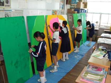 1年生が卒業生に送る全員でのモニュメント作りが着々と進んでいます。今日はテスト最終日。1年生の選抜チームがモニュメントの土台、下絵の作成です。この後全員で折り紙の鶴を飾っていきます。出来上がりを楽しみにしておいてください。