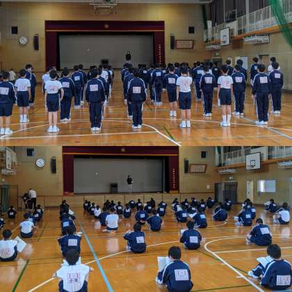 【体育】1・3年合同での体育です。体操隊形にひらいてラジオ体操をします。ラジオ体操のテストがあります。評価の基準を説明していました。しっかり確認してテストに備えましょう。(1・3年3組)