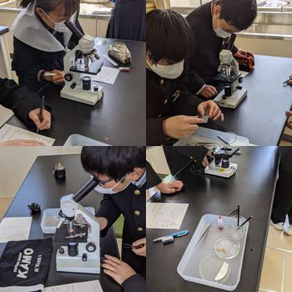 【理科】タマネギとオオカナダモの細胞を観察しています。酢酸オルセイン溶液をつけて細胞を見やすくしています。(3組)