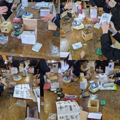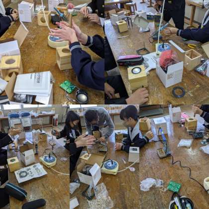【技術】ラジオ作りをしています。はんだごてを使って、基盤にはんだづけしていきます。キリを使って箱に穴をあける作業の生徒が多かったです。(1組)