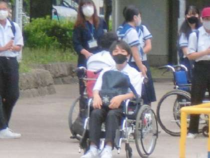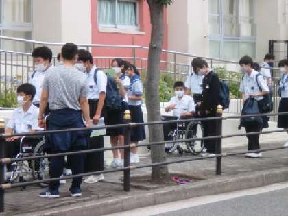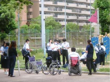 学校の様子(車いす体験学習)歩道の段差・駅周辺・公園・河川敷など人にやさしい町づくりの調べ学習。感染症対策・密をさけるコースなど、緊急事態宣言下を十分考えた上でのプランでの実施となりました。