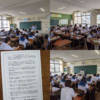 【1年】担任の先生がテストの受け方について説明しています。来週月曜日から中学校に入学して初めての定期テストがあります。中間テストがなくなって、テスト範囲も広くなっていると思います。早めの準備をしてください。