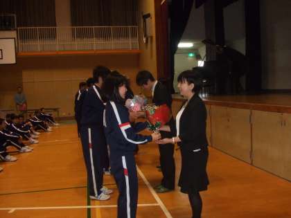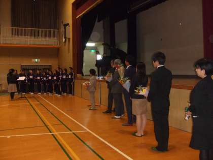 今年度末を持って、9名の先生方が、ご退職・ご転勤となりました。うちお二人は昇任のため、発令式と重なってしまいましたので、ご欠席でしたが、卒業生、保護者の方々も大勢お越しいただき、別れを惜しみました。音楽部のコーラスに導かれながらの退場です。