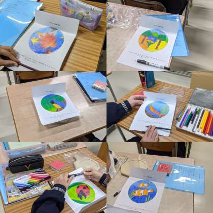 【美術】モザイクチップの作成です。カーボン紙を使って下絵を写していきます。(3組)