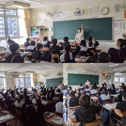 【社会】先生の質問に生徒たちは手を挙げて答えていきます。みんなで前方後円墳を指で描いていました。(2組)