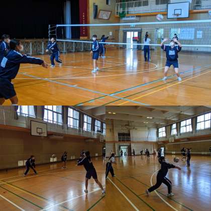 【体育】女子は体育館でバレーボールです。レシーブ、トスでつなぐ練習をしています。