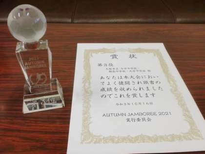 学校の様子(サッカー部表彰)サッカー部の表彰がありました。3位でクリスタルトロフィーもいただきました。おめでとう!