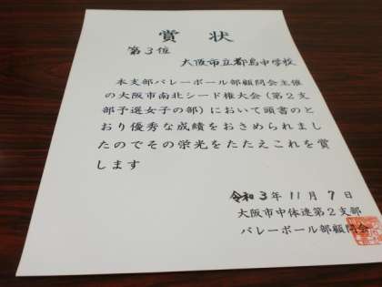 学校の様子(放送集会 表彰)卓球部とバレーボール部の表彰がありました。卓球部はHPで、すでにご紹介していますので本日は、バレーボール部の第2支部予選女子の部大阪市南北シード権大会第3位表彰をしました。おめでとう。校長講話では、立冬の講話で、「冬の気立ち、始めて、いよいよ冷ゆれば也」で、この時期、「一日1個のりんごは医者いらず」のお話から、「食」を通じて健康保持を考えてみようとの話でした。この後古川先生より、生活指導のお話。生徒専門委員会での報告がありました。
