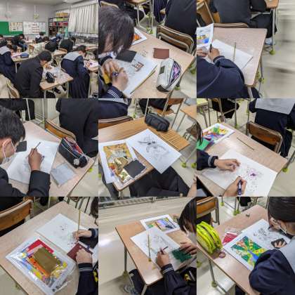 【美術】プッシュ日本画の作品を作っています。切り取ったところに色を入れていきます。(3組)